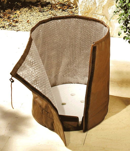 De potplantenbescherming Thermo Plus beschermt uw potplanten tegen uitdroging, kou, wind en regen. Binnenin de weer- en UV-bestendige vlieszak zit een dubbellaagse noppenfolie die optimale bescherming biedt tegen vorst, wind en vocht. Aan de onderzijde van de potplantenbescherming Thermo Plus bevindt zich een 4 cm dikke isolatieplaat van piepschuim met een afwateringsopening. Dit beschermt de potplant tegen opstijgende permafrost en stuwvocht. Praktisch: met de snoer- en klittenbandsluiting is het inpakken van uw potten en kuipen kinderspel. Herbruikbaar. Potplantenbescherming Thermo Plus beschermt uw planten betrouwbaar in de winter.